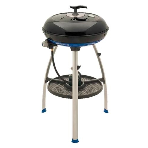 Den komplette gassgrillen med teflonbehandlet stekeplate og grillplate, kasserolleholder og lokk.