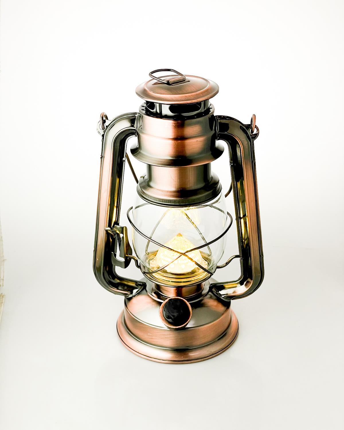 Enkel og dekorativ fjøslykt med 15 stk lysdioder. Lykten er lakkert med kobberfarge. Leveres med fin gavepakning.